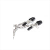 Pinzas para los pezones con cadena metálica en color plata de gran calidad. Las pinzas están recubiertas de suave silicona negra y disponen de un sistema de seguridad para controlar en todo momento el nivel de presión sobre el pezón.