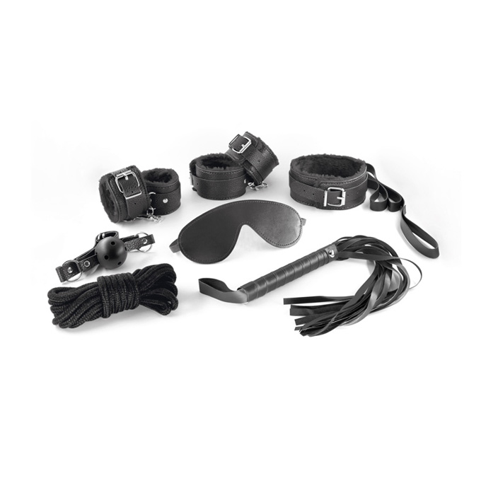 Completísimo kit de bondage en color negro imitación cuero. Ideal para tener todos los accesorios necesarios para explorar los juegos de dominación y sumisión por un precio apto para todos los bolsillos.