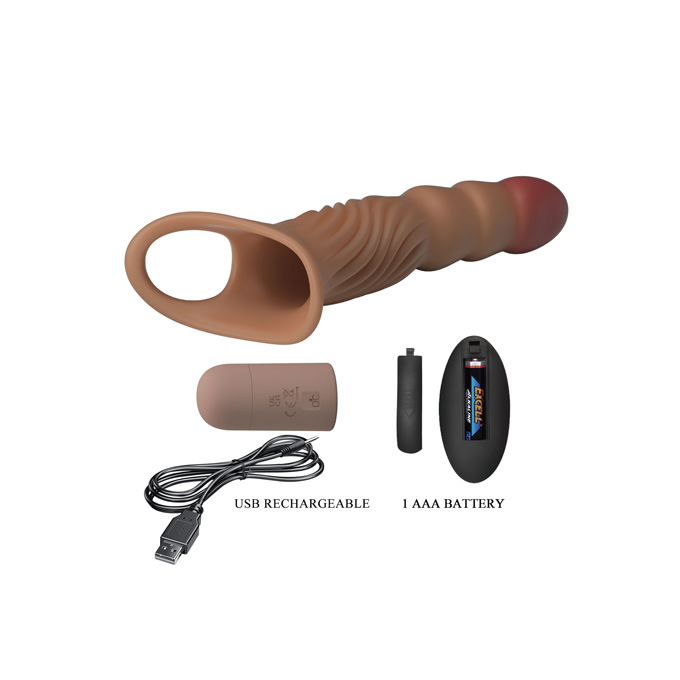 Esta excelente funda, no solo estimula durante la penetración con su multitud de estrías, sino que además su punta es vibradora, convirtiendo tu pene en un vibrador humano.