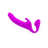 Arnés doble tipo strapless o sin tiras. Realizado en suavísima silicona médica 100% totalmente hipoalergénica. Juguete pensado para un estímulo intenso, incluye vibración en ambas zonas insertables y tapping en la zona del clítoris.