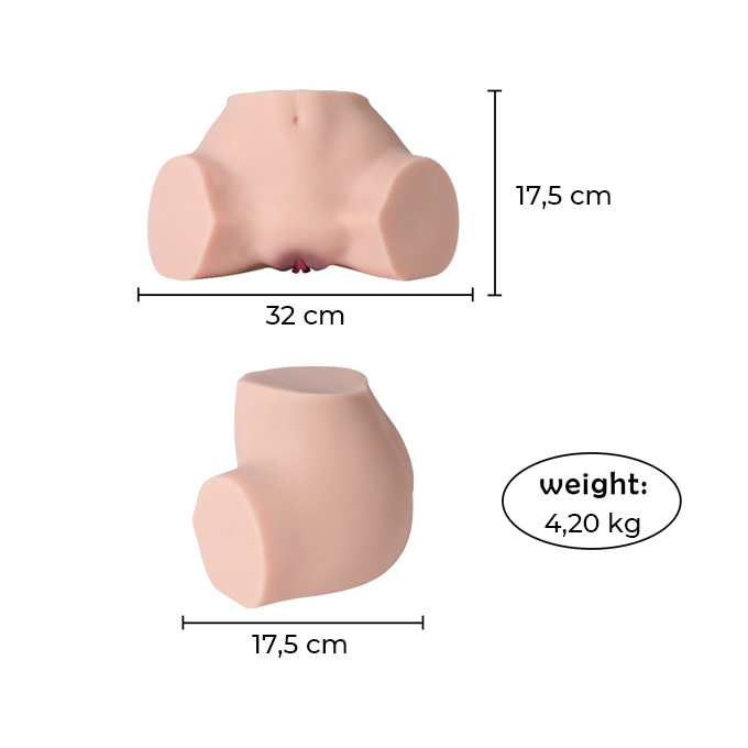 Cuenta con dos orificios, vagina y ano con textura interior diferente. Dos estímulos en un solo juguete. Lavable. Tacto sedoso y realista.