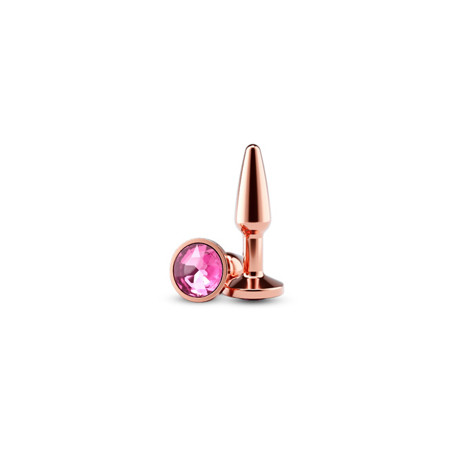 Plug de iniciación talla muy pequeña realizado en aluminio en color oro rosa y decorado con un brillante fucsia.