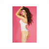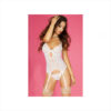 los tirantes como los ligueros son ajustables. Incluye corpiño y tanga. Decorado con pedrería en forma de corazón en el escote.