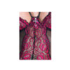 Espectacular corpiño con encaje en color rojo frambuesa que incluye un tanga a juego. Sujetador con aros para realzar el pecho. Tirantes regulables y broche en la espalda también regulable.