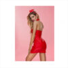 - Vestido efecto vinilo rojo que se abrocha en el cuello.