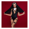 Completo disfraz de monja combinado con tela efecto cuero y transparencias.