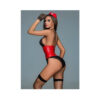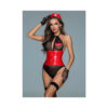Completo disfraz de enfermera que combina las transparencias en negro, con un corset rojo brillante. Incluye todos los accesorios.