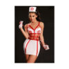 - Vestido completo de enfermera con bordados en el pecho y tiras elásticas en color rojo.