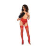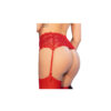 Incluye liguero de encaje con tiras regulables, tanga a juego y medias lisas rojas.