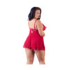 Fantástica prenda que no puede faltar en tu armario. Se trata de un picardías en color rojo, con vuelo doble y encaje en el busto que podrás abrir y cerrar a tu gusto, puesto que tiene unos lacitos en las copas para dejar volar tus fantasías. Prenda de gran calidad.